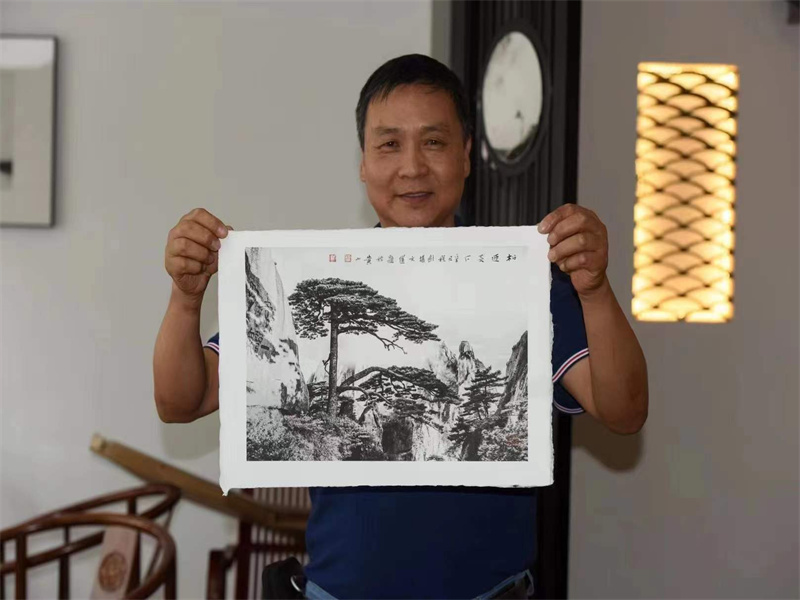 公司總經(jīng)理朱建新應(yīng)攝影大師程劍邀請參加市文聯(lián)創(chuàng)藝基地授牌,作品是黃山攝影大師拍攝的,由黃山市書法家協(xié)會主席題了字,是攝影作品與書法結(jié)合體現(xiàn)在我們生產(chǎn)的紙上的作品,是非常好的創(chuàng)意